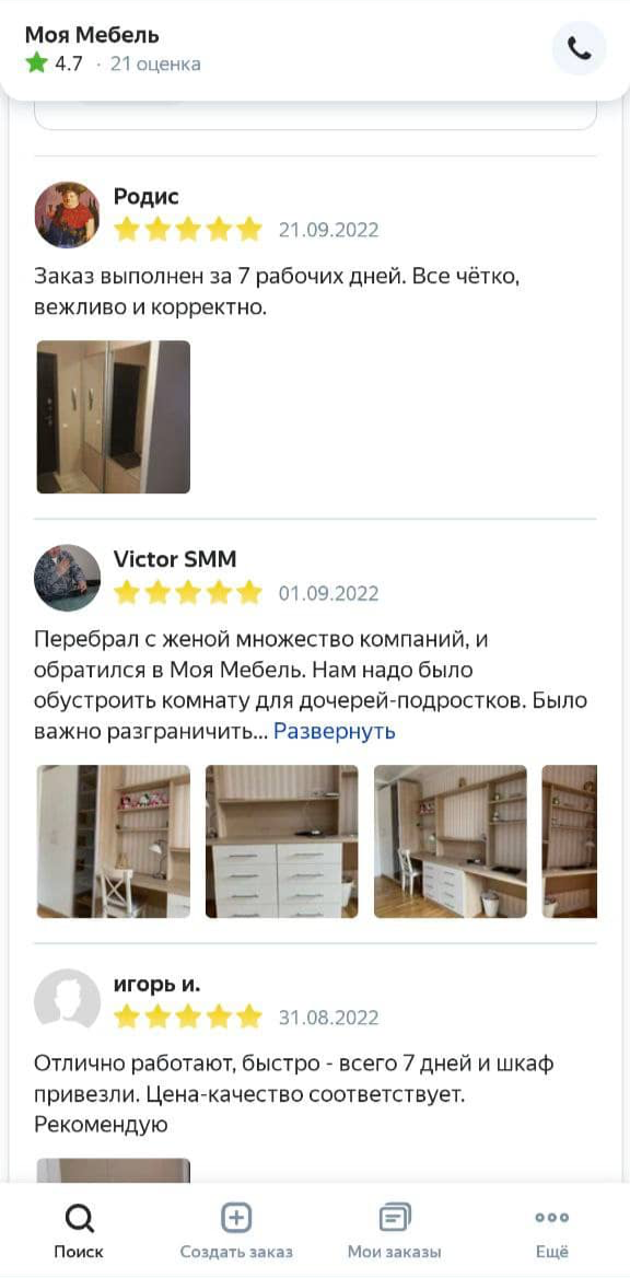 Меня зовут Марина и я уже более 15 лет работаю главным технологом на фабрике Моя Мебель. За это время мы выработали уникальную систему производства корпусной мебели без сколов и с минимальными допусками. Я с радостью помогу Вам подобрать мебель под любой интерьер и любых размеров. Наши курьеры поднимут изделие на Ваш этаж, даже если лифт не работает, а сборщики установят все за один день, без пыли и мусора.